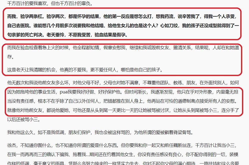 从徐杰前女发布的文章来看,可以说内容非常丰富,讲述了很多她和徐杰之间的故事,同时她也发布了很多两人之间的交流信息。比如,为了成为徐杰背后的女人,她放弃了进外企的机会,把所有的时间和精力都给了徐杰,陪伴徐杰参加比赛和训练。基本上,她为徐杰付出了几乎所有的时间。三个月内,我去广东约会徐杰十多次!(显然徐杰的前女友不是广东人,两人是异地恋。)