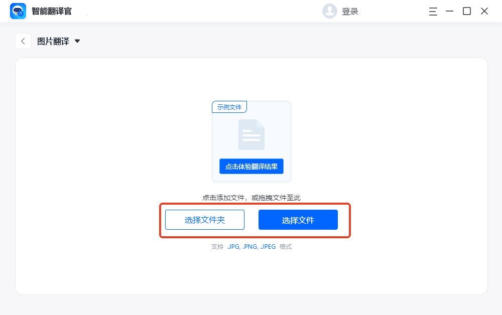 软件支持同时翻译多张图片,提升翻译效率,可以直接选择文件夹上传一整个所有图片,也可以点击【选择文件】上传多张图片进行翻译。