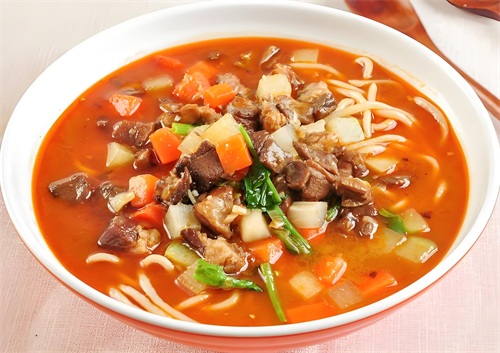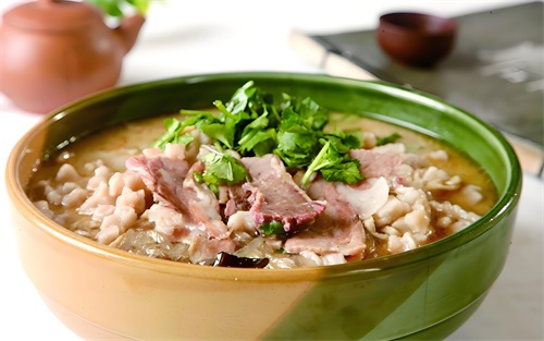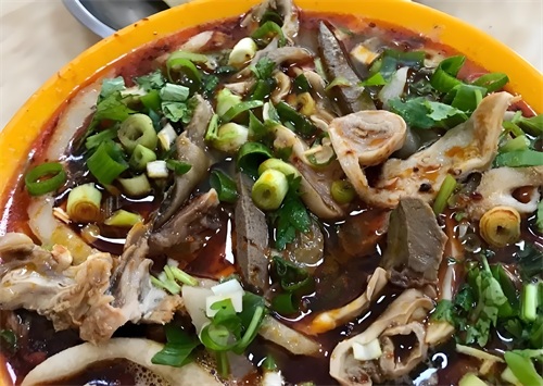 烩羊杂碎是宁夏的传统美食,尤以吴忠地区的羊杂碎出名,烹饪时将羊头、羊肚、羊心、羊肠等羊杂碎与羊肉汤一同煮制而成。配上独有的辣椒,早餐不二之选。