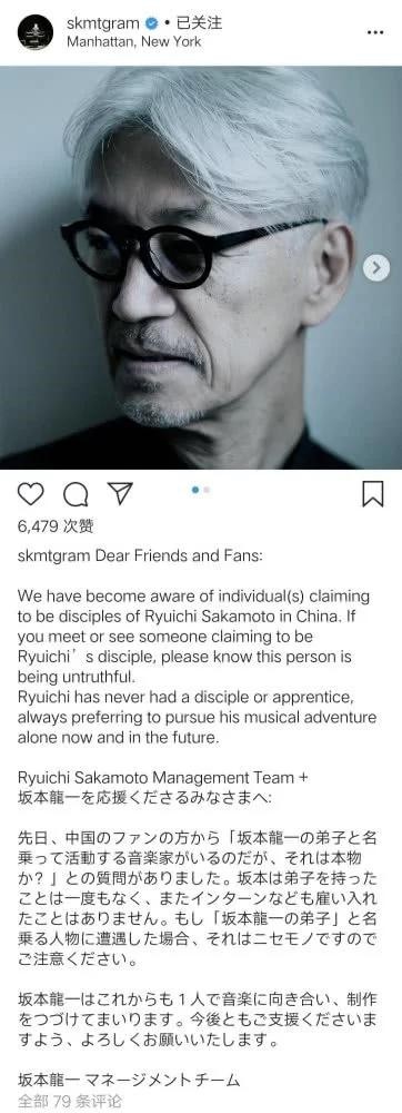 日本音乐家坂本龙一打假,“我没收过中国弟子”