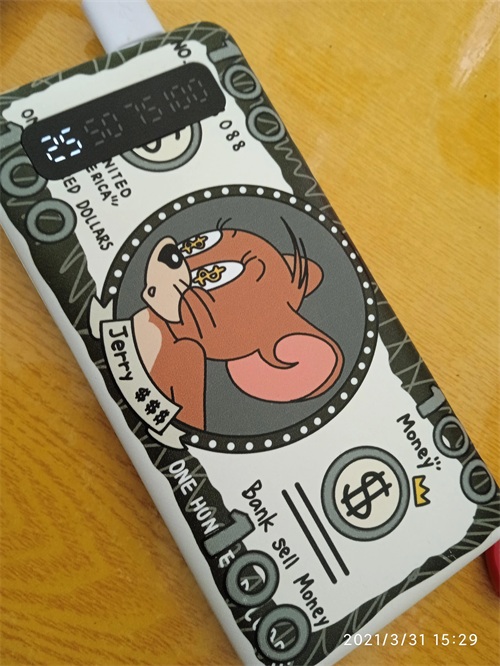 从外观来看 充电器配备一个安卓祖传的micro USB和一个安卓Type-C接口和两个输出的USB公口及两个LED小灯可充当手电筒使用 在侧面还具有一个控制手电的开关按钮 正面是一个Jerry鼠的美钞图 背面是白色背景 同时在下方注明了型号 电池能量 电池容量 输出和输入的功率速度 执行标准 生产日期 制造商 一个fc标识 一个ce标识 可回收标识 不可火烧标识 不可直接丢弃标识