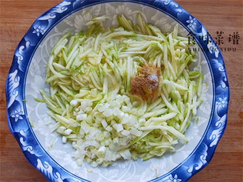 7、这一步就到调味了,依次放入五香粉、葱花和食盐,盐尽量少放点,因为上一步腌制的时候,已经提前放过盐了,太咸了也不好吃,把调味品搅拌均匀。