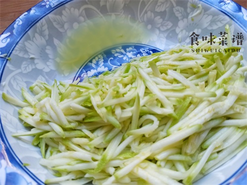 3、舀小半勺食盐,均匀地撒在上面,翻拌均匀,腌制十分钟,逼出西葫芦丝内部的水分,这样有利于口感脆爽,更好吃。