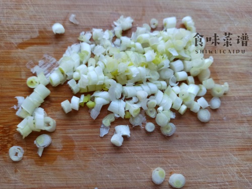 4、趁着腌制的时间,准备一些葱花,大葱小葱都可以,主要是为了增加葱香味,这也是让“糊塌子”好吃的秘诀之一。