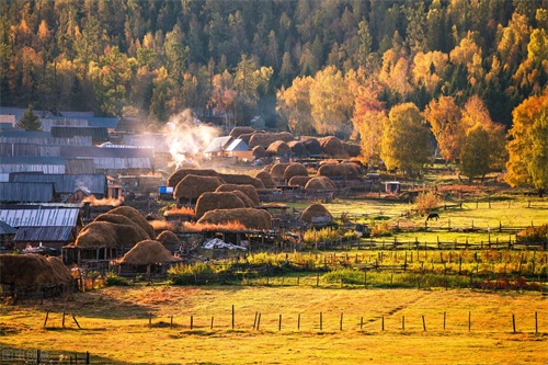 村子里的房屋,大多是朴素的木头房,分布在沟谷底,金黄色的桦树和杨树点缀,还有两条清澈的小河环村流过。