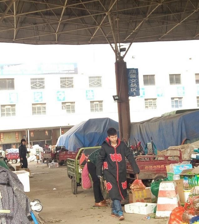 “晓组织”的成员其实还神的不少,这不刚打算去市场上买个菜,就碰到一位刚买完菜,打算回家的组织成员。只见他提着菜大步往前走,这一身衣服还是挺合他身的。
