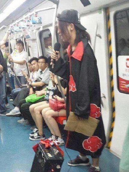 这小哥带着音响设备,在地铁里卖唱,看这架势是刚从漫展回来麽。不过看上去挺有意思的,不过这种行为是不值得学习的,在地铁这种公共场所,即便不是卖唱,用这么一个大音响也是会打扰到其它人的。