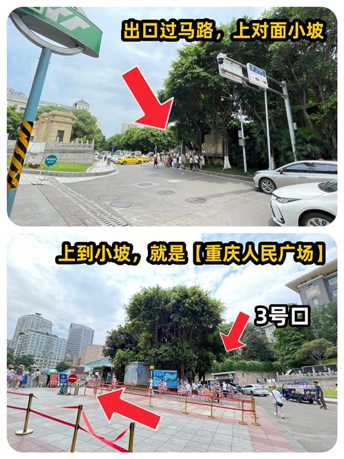 轨道2号线【曾家岩】站,3号出口,出去后到马路边,过马路上坡就是【重庆人民广场】。
