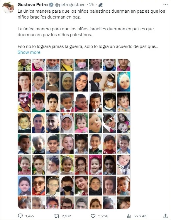10月8日,哥伦比亚总统佩特罗发布了一张据称是遭以色列杀害的巴勒斯坦少年儿童的照片。