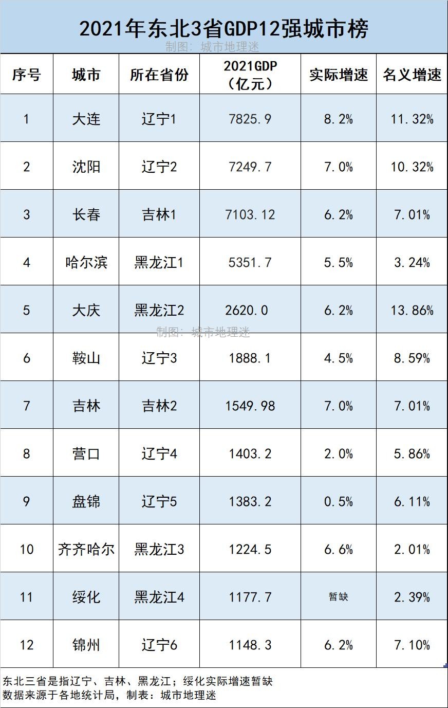 根据国家统计局公布的2021年国民经济和社会发展统计公报,2021年整个东北地区生产总值55699亿元,增长6.1%。东北地区是指辽宁、吉林和黑龙江3省。以下为2021年东北三省GDP前12名的城市榜单。