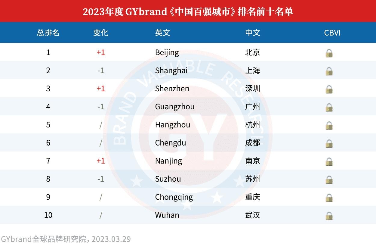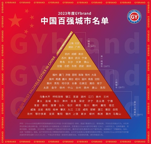 3月29日,GYbrand全球品牌研究院独家编制的2023年度中国百强城市正式发布。这是一份全面展示中国城市高质量发展成效的榜单,主要评估依据是品牌价值,并不是简单按照城市GDP或者人口规模排序,而是从经济实力、质量建设、商业资源、文化体验、居住生活、发展潜力等六大指标进行综合评价,最终发布2023中国城市排名100强名单。