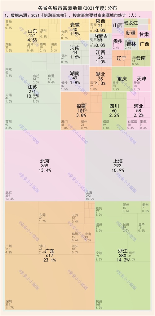 下图中,用方块面积表示城市和省份的富豪数量,方块面积越大,表示富豪数量越多。同时,方块面积占图表的比例,展示了城市或省份富豪占全国的比例。