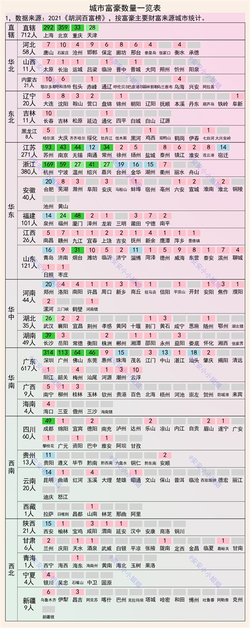 城市二十亿富豪数量:北京和深圳超过300位,广东浙江富豪多