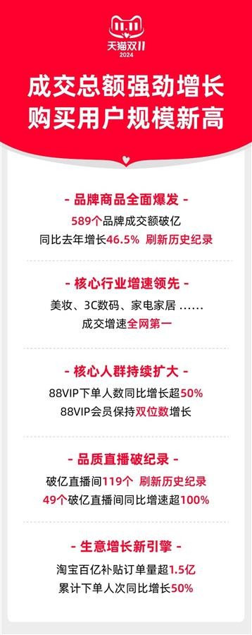 2024天猫双11战报出炉:589个品牌成交额破亿,购买用户规模创新高