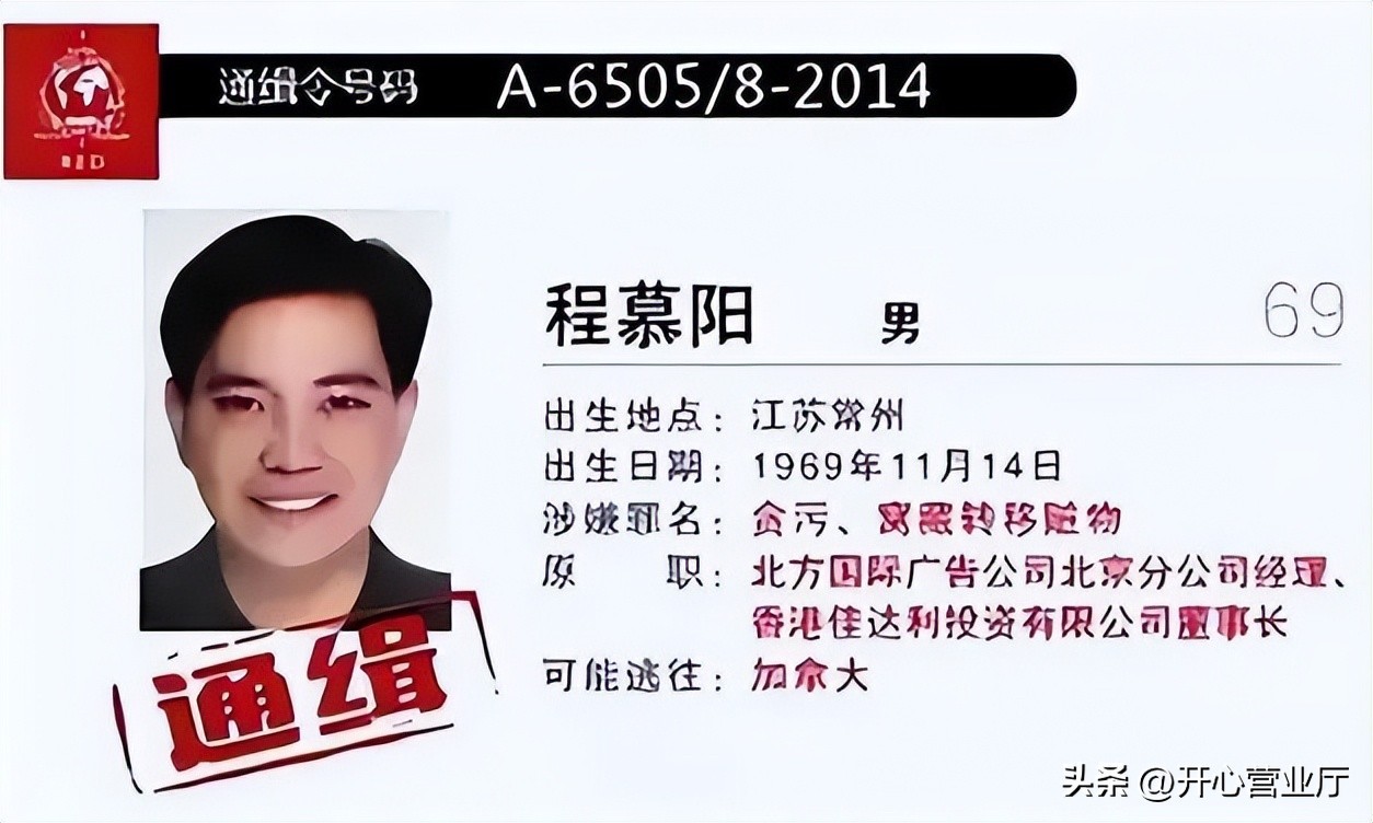 2015 年,我国发布红色通缉令,公布了百名外逃人员名单,程慕阳的名字赫然在列,被国际刑警组织中国国家中心局发布的红色通缉令所通缉,他成为了众多外逃人员中的一员,其犯罪行径被公之于众。