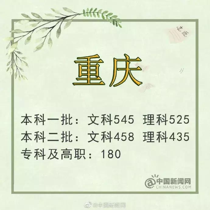 23日,重庆市公布2019年全国普通高校各类招生录取最低控制分数线。第一批本科文史类545分、理工类525分;第二批本科文史类458分、理工类435分;文高职专科批:180分。