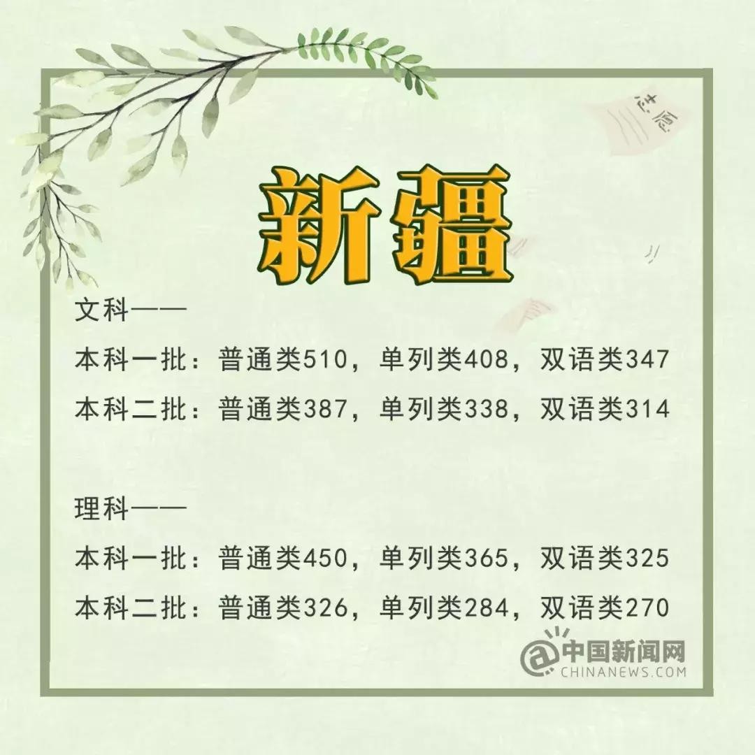 据新疆教育考试院消息,新疆维吾尔自治区2019普通高校招生各批次最低投档控制分数线6月26日公布,其中,文史类一本普通类510分,单列类408分,双语类347分;二本普通类387分,单列类338分,双语类314分;高职(专科)180分。理工类一本普通类450分,单列类365分,双语类325分;二本普通类326分,单列类284分,双语类270分;高职(专科)180分。