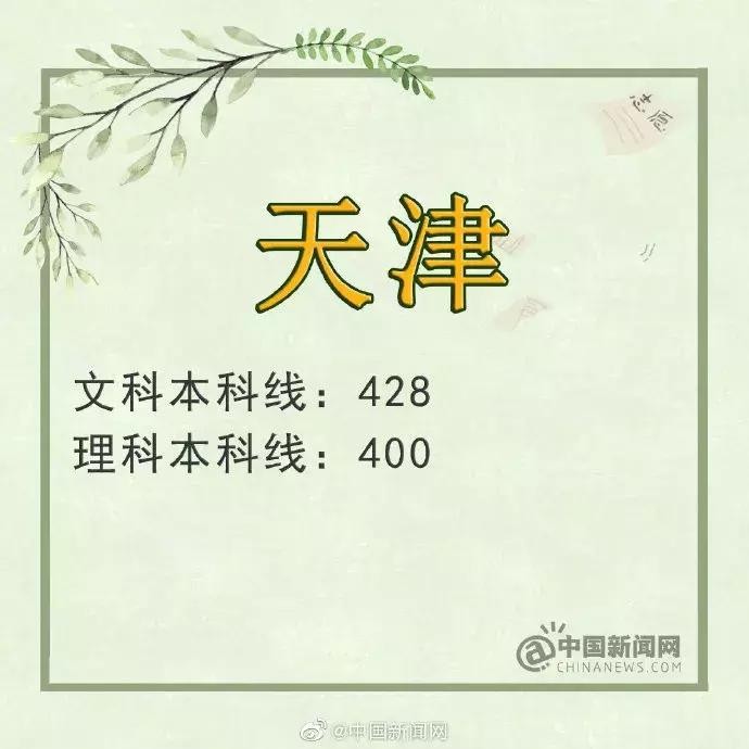据天津市人民政府新闻办公室官方微博消息,6月23日,天津市普通本科批次录取控制分数线确定:理工类400分 文史类428分。艺术类(含文理):理工280分,文史299分;体育类:理工374分,文史380分。