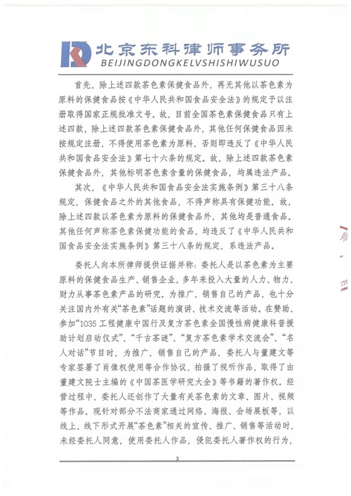 委托人向本所律师提供证据并称:委托人是以茶色素为主要原料的保健食品生产、销售企业,多年来投入大量的人力、物力、财力从事茶色素产品的研究。为推广、销售自己的产品,也十分关注国内外有关“茶色素”话题的演讲、技术交流等活动。在赞助、参加“1035工程健康中国行及复方茶色素全国慢性病健康科普援助计划启动仪式”“千古茶谜”“复方茶色素学术交流会”“名人对话”节目时,为推广、销售自己的产品,委托人与董建文等专家签署了肖像权使用等合作协议,拍摄了视听作品,取得了由董建文院士主编的《中国茶医学研究大全》等书籍的著作权。经营过程中,委托人还创作了大量有关茶色素的文章、图片、视频等作品。现针对部分不法商家通过网络、海报、会场展板等,以线上、线下形式开展“茶色素”相关的宣传、推广、销售等活动时,未经委托人同意,使用委托人作品,侵犯委托人著作权的行为,特授权本律师发表如下严正声明: