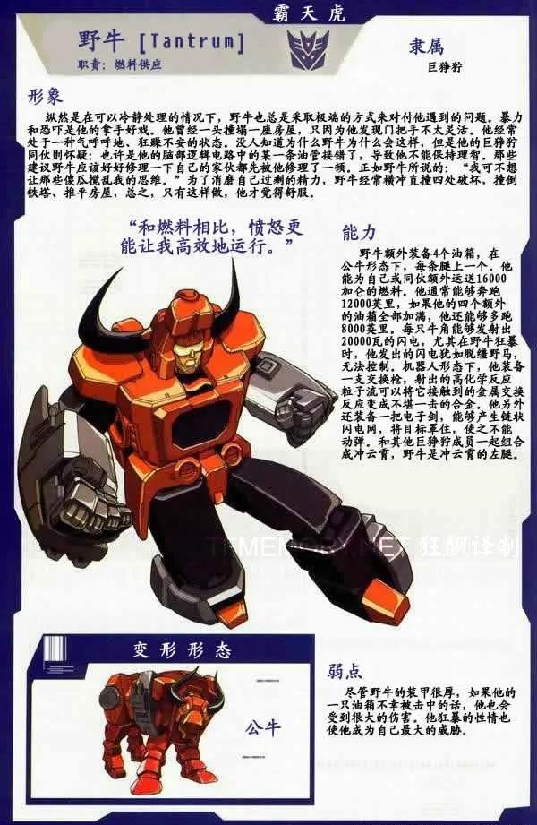 野牛是胸甲战士中的野蛮工兵,脏活累活都是他的。他可以变形为为一辆双管坦克,具备强悍的火力和装甲防御,是一个嗜血如命,好战成狂的猛兽。野牛喜欢一路碾压敌人的尸体,将他们赶尽杀绝。其胸甲变形为一头野牛,同时可以变形为枪械。