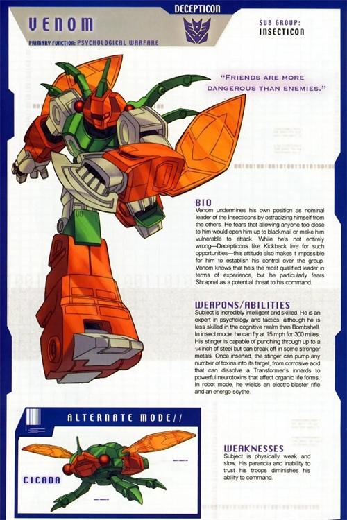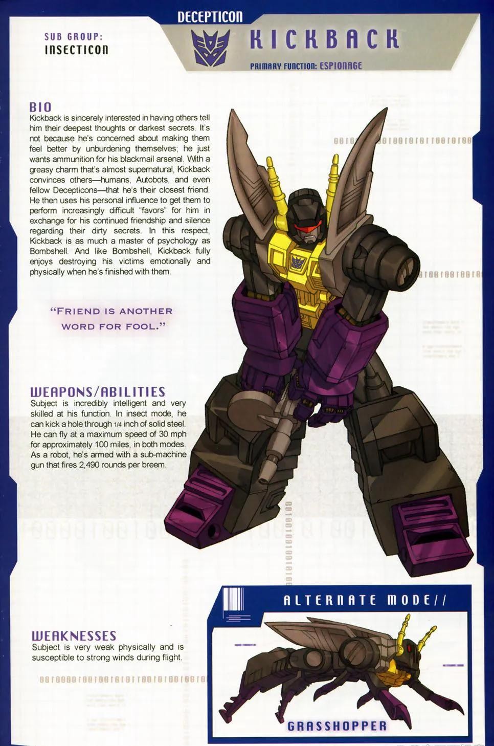 他完美的诠释了机器昆虫的特点:欲求不满,贪得无厌,对霸天虎毫无纪律而言。弹片擅长电子战,昆虫形态下他可以用触角控制任何电子设备,机器人时则可以用它来吸引闪电,作为武器发出。