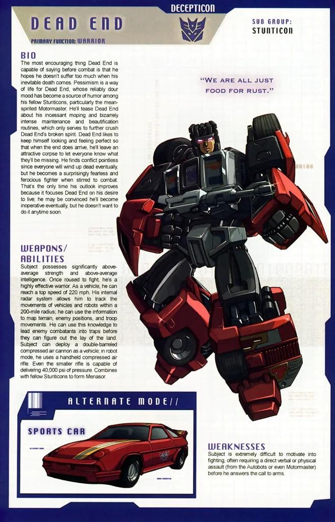 霸天虎成员,性格自负,以戏剧性登场震慑敌人为乐,战前狂轰滥炸宣告其到来,但实战策略不及挽歌,且常在关键时刻逃避危险。