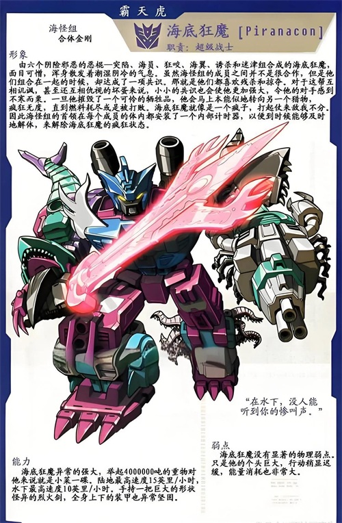 海底狂魔是海洋战士们的组合体,狂野的海底生物组合。将战士们的残忍性格汇聚在一起,体现为对博派的执着猎杀。海底狂魔的海战能力是最强的,因为太重,在陆地跑的很慢。