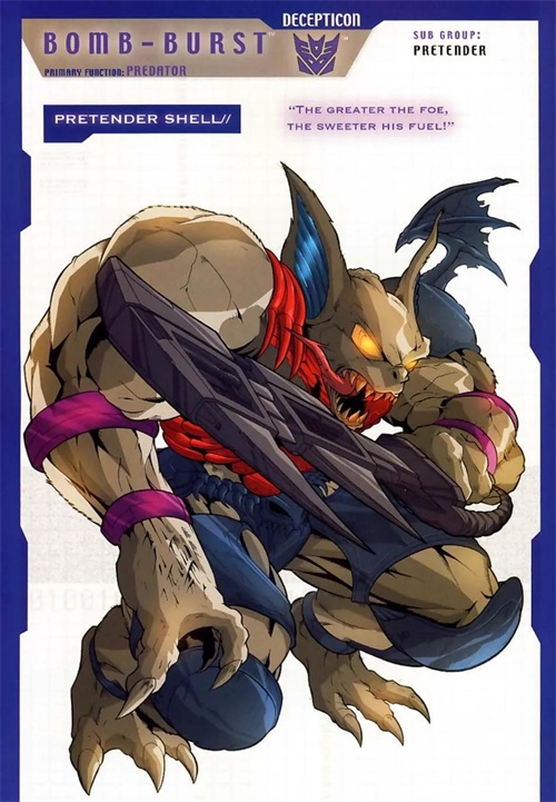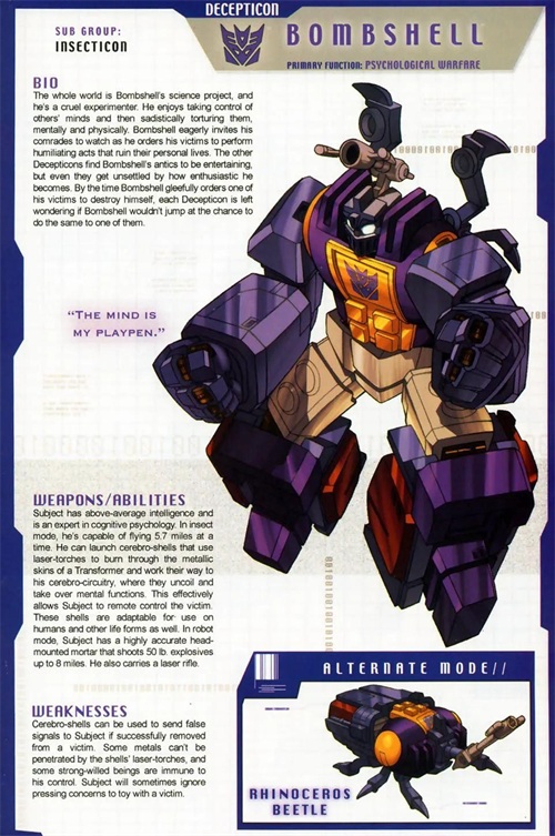 霸天虎机器昆虫成员,能够变形成犀角甲虫。高智商的实验者,擅长认知心理学,喜欢通过长刺将脑神经弹植入目标头部,控制他们的意识。炸弹具有残忍的幽默感,能操纵受害者自残。