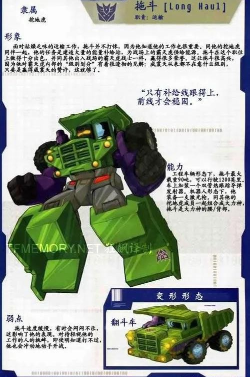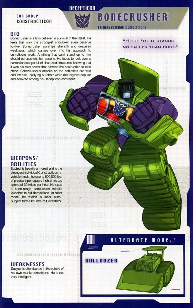 推土机,挖地虎成员,以破坏为乐,力量强大,身披重甲,战场上狂野激烈,是“适者生存”的坚定信徒,变形为推土机,构成大力神的左臂。