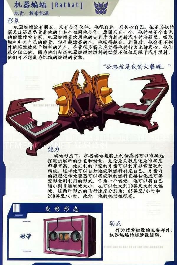 机器蝙蝠,霸天虎成员,变形为磁带。机器蝙蝠隶属于声波下属的磁带军团,是霸天虎的情报人员,官设还有能源搜索的职责。