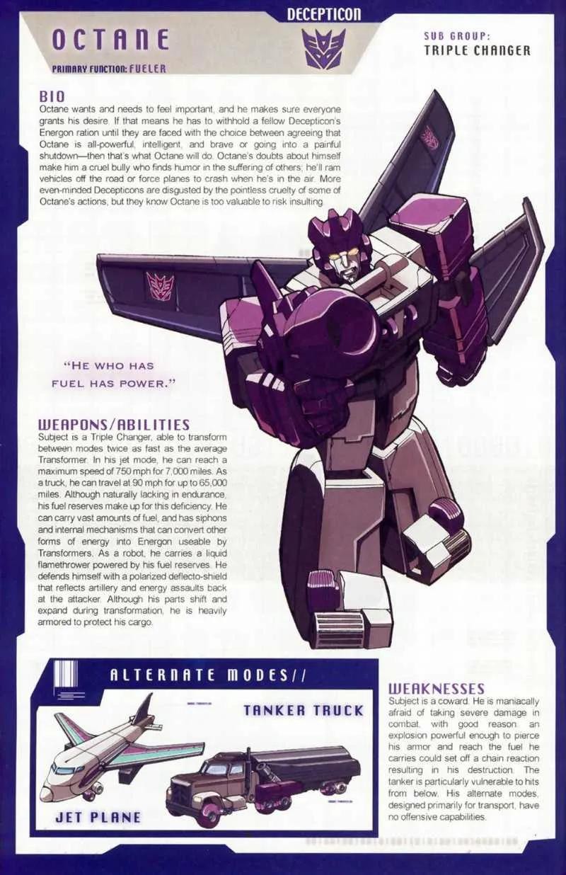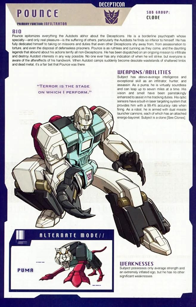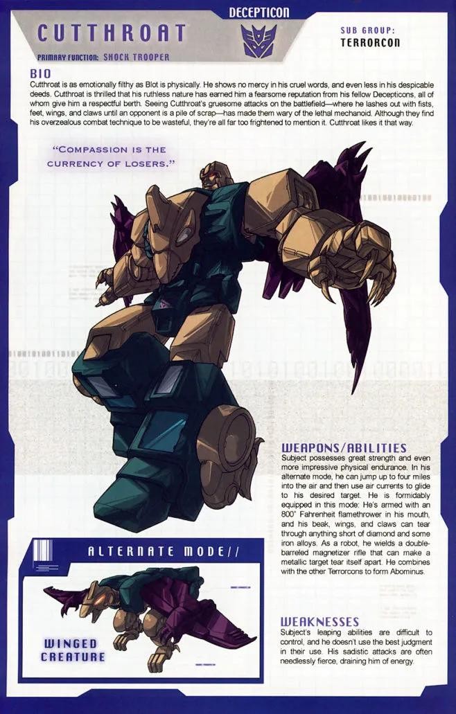 胆小而懦弱的三段变形战士,对战斗充满恐惧的他常常利用其的变形优势逃跑和伪装自己。而得过且过的生活态度也使他得以左右逢缘于博派与狂派之中。
