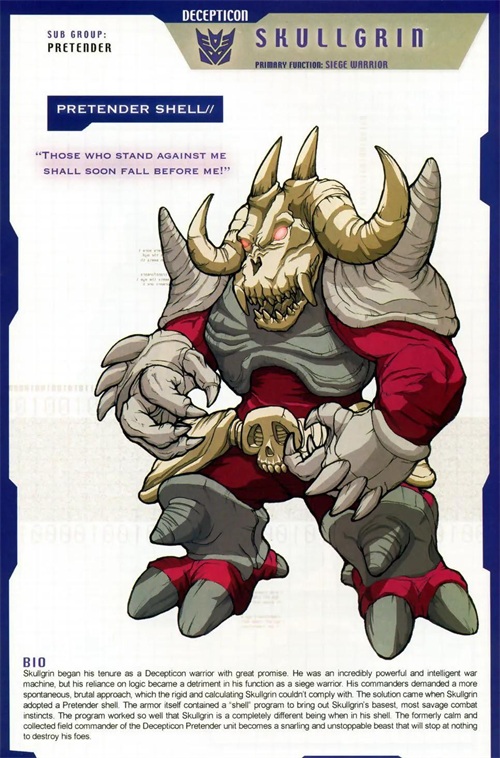 天灵盖原本是智勇双全的霸天虎战士,不但身强体壮,还聪慧过人。但是身为围攻战士,他过于依赖逻辑的思维模式常常让他束手束脚,无法达成指挥官希望平推突进的战术要求。直到天灵盖拥有了隐者外壳后才得以改善,山羊魔的隐者机甲本身的外壳程序让天灵盖最原始的战斗本能被激发出来,原本冷静狡猾的战地指挥官变成了一头嗜血凶兽。
