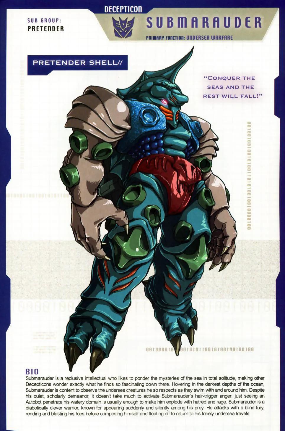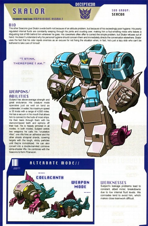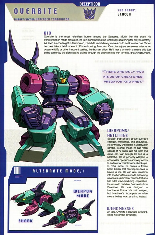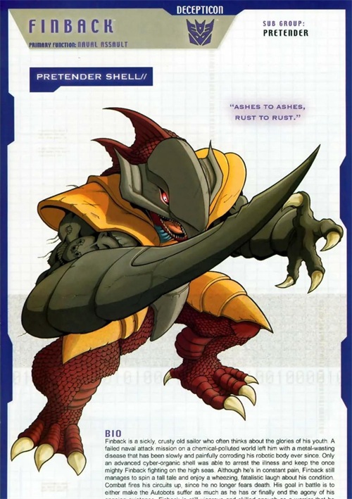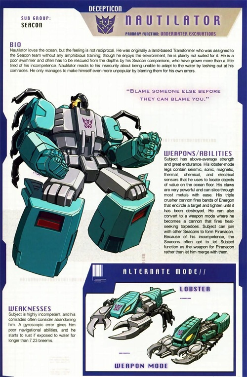 海狼是个霸天虎中的异类,他喜欢远离喧嚣,独自一个人沉思海洋的秘密,这让其他霸天虎感到好奇。