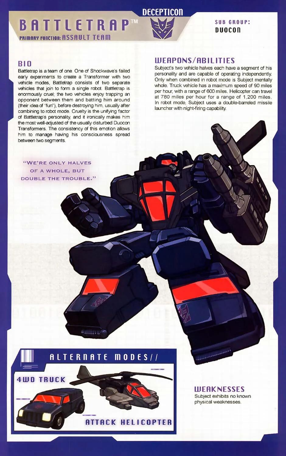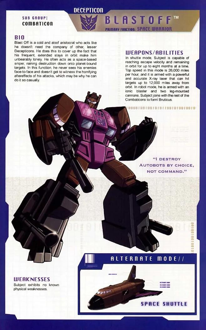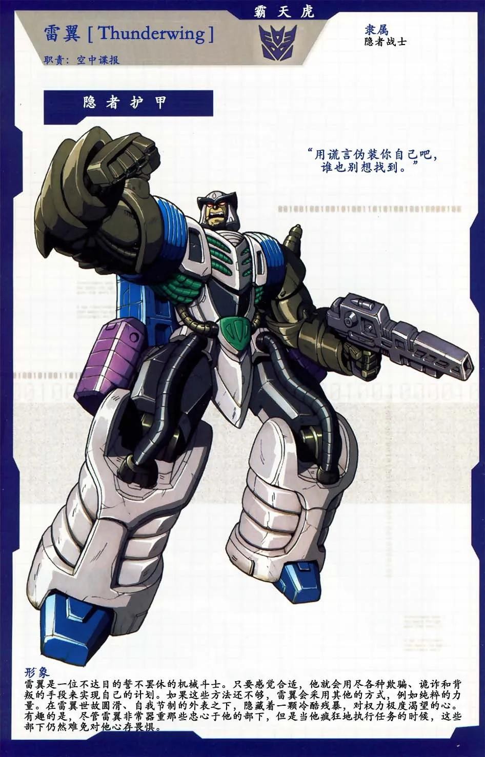 霸天虎成员,担任陆空指挥官,所属部队是三变金刚,以“先毁灭再思考”为格言。