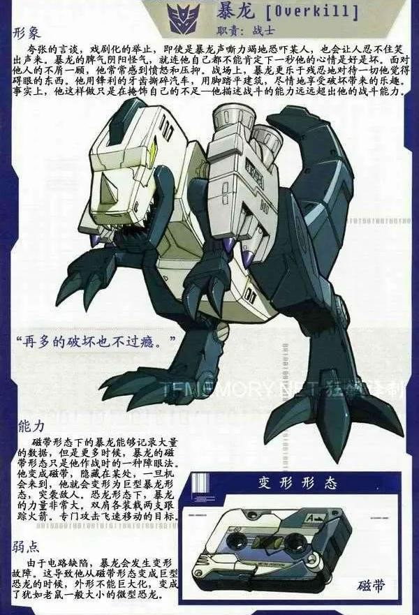 暴龙,霸天虎成员,隶属于声波的磁带军团,能够变形为磁带。无论是说话,破坏,还是攻击,他做每件事都毫无节制。