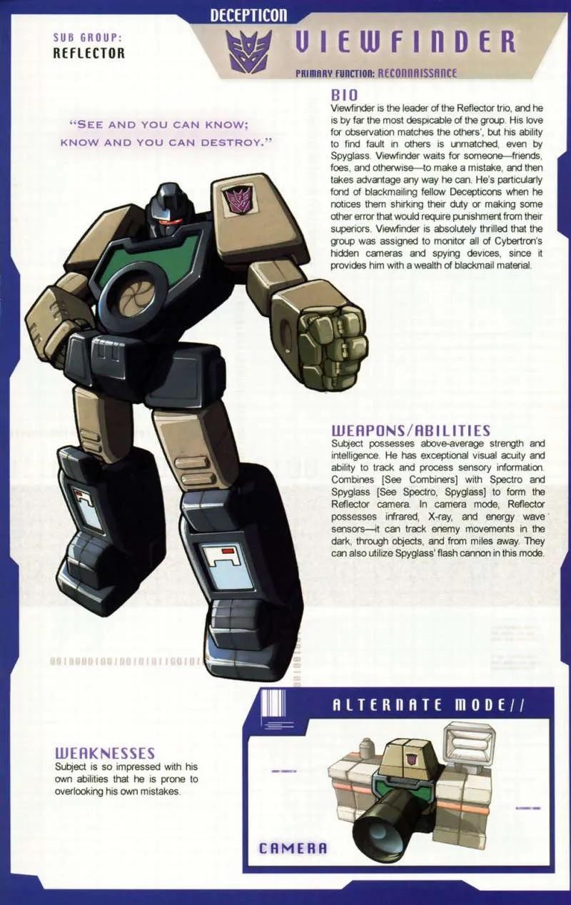 反光镜,隶属于霸天虎,照相机部队三个成员之一,可以与分光镜和聚光镜一起变形为照相机。