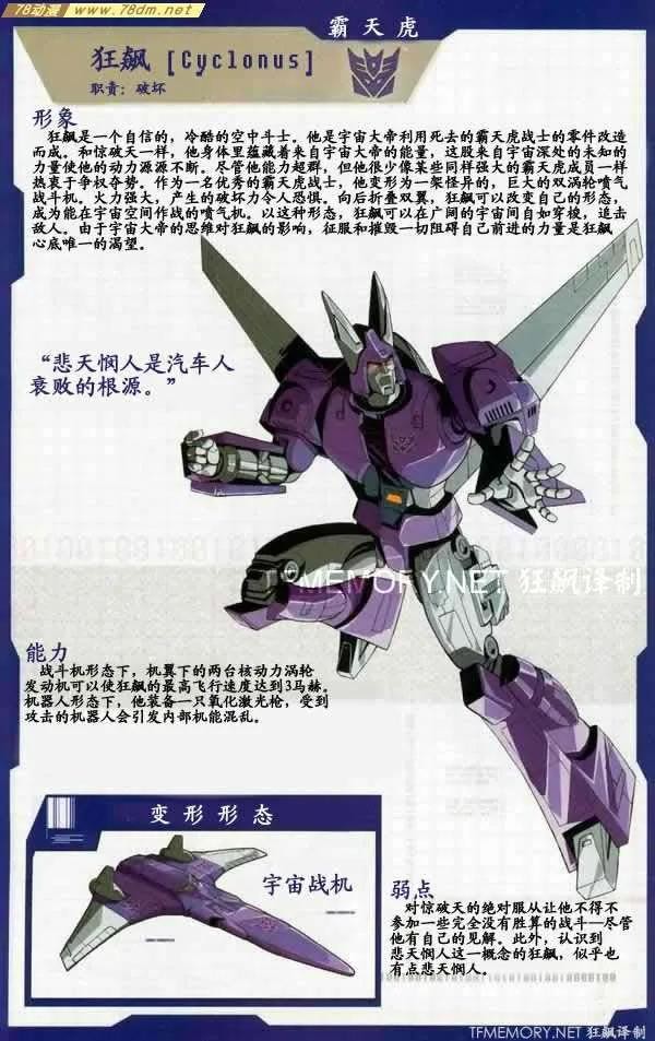 霸天虎成员,可变形为F-15超音速战斗机,飞行小队队员,是一个鬼祟阴险的霸天虎战士。