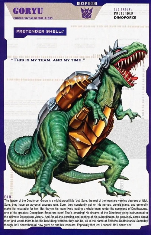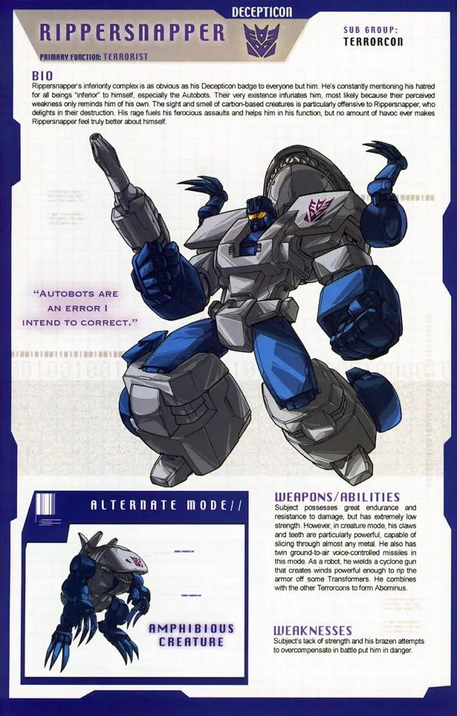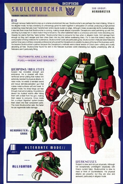 鳄龙是霸天虎头领战士的一员,可以变形成为机械美洲鳄,耐力和体力极强,不过头脑也很迟钝。