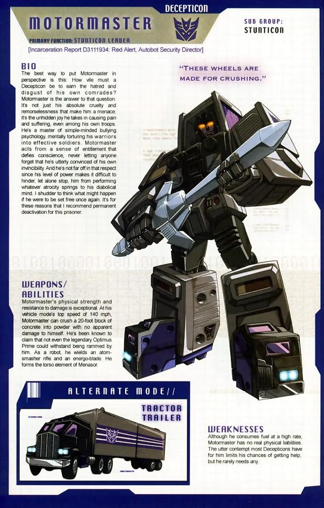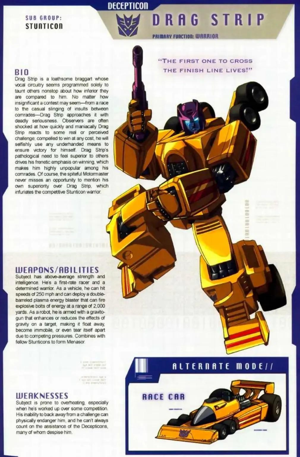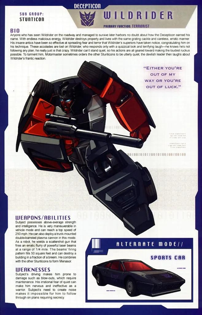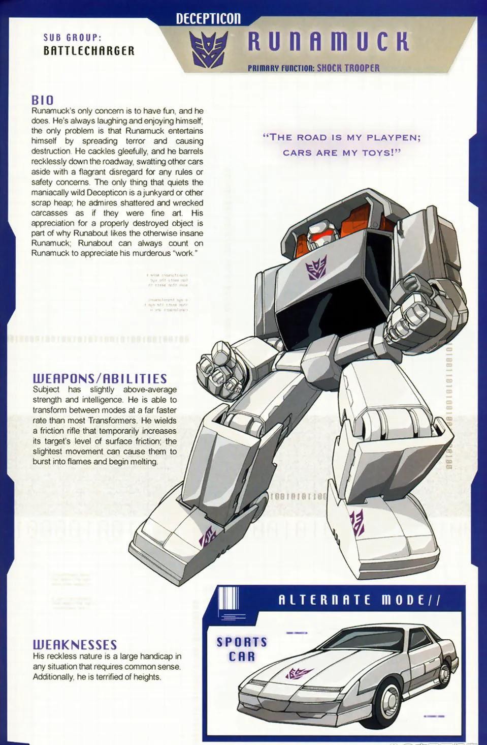 性格直率,行为粗野的霸天虎勇士,以疯狂的速度驰骋于公路之上的汽车大师号称公路之王。与多数霸天虎不同的是,他除了战斗外也非常看重自己作为一名霸天虎战士具有的荣誉。