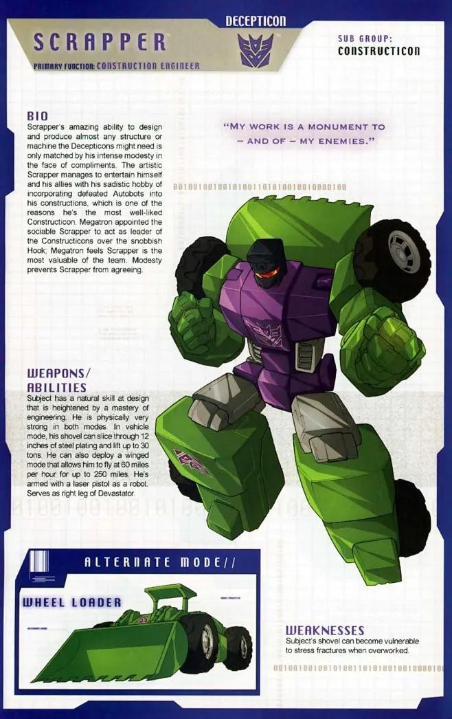 铲土机具有令人惊赞的高超技术,以至于他几乎可以设计或生产霸天虎所需要的任何建筑和机械。面对一片赞美之词,铲土机也会显得羞赧而谦逊。出于自己的施虐兴趣,充满艺术天赋的铲土机往往会将被打败的汽车人俘虏拿来装饰自己的建筑物。这不仅令自己和伙伴们无比开心,同时也使他成为最受同僚欢迎的霸天虎战士。