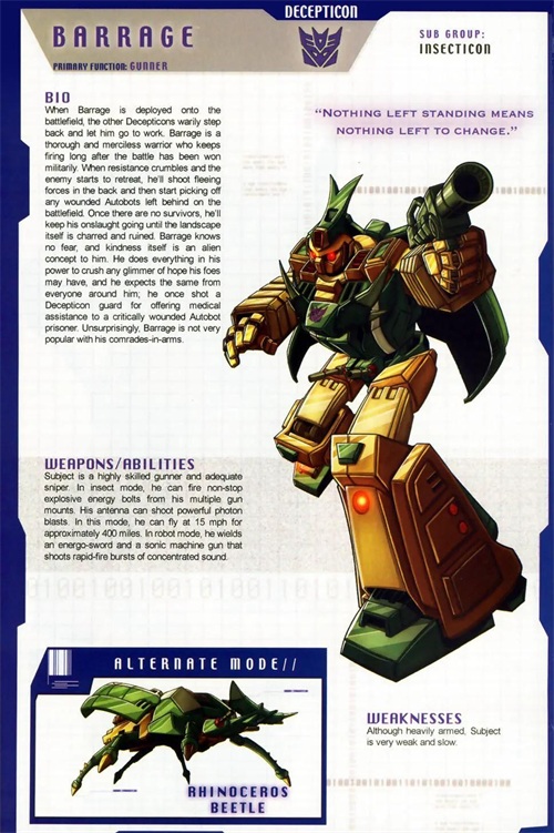 变形为独角仙。弹幕是个做事极端的机器昆虫,他在战斗取胜后还会继续倾泻弹药,直到土地都被烧到寸草不生。