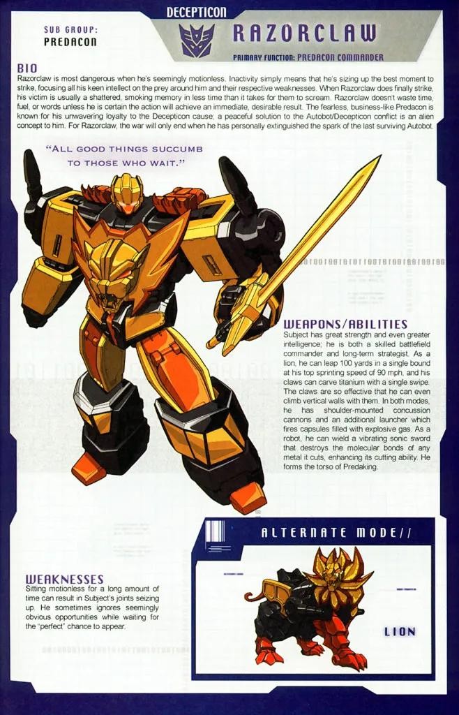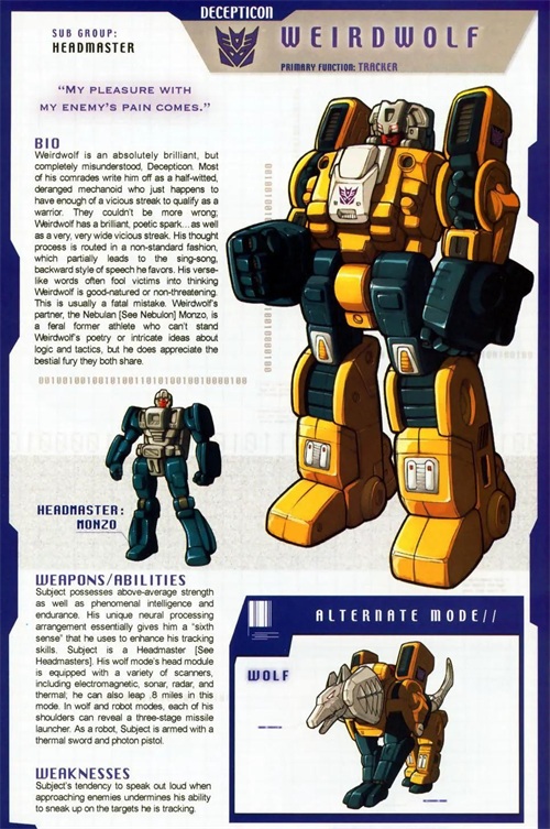 霸天虎头领战士指挥官,可以变形成机械狼。撒克巨人的冷酷亲信,战场上无情的亡命之徒,自尊心极强,渴望证明自己的实力。