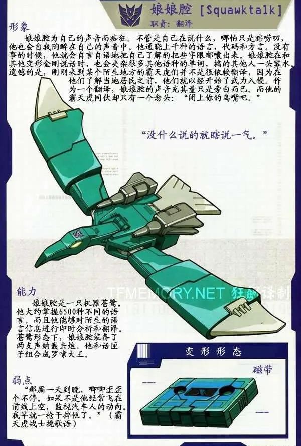 娘娘腔是霸天虎成员,隶属于声波的磁带军团,能够变形为磁带,整天叽叽歪歪唠叨不停。