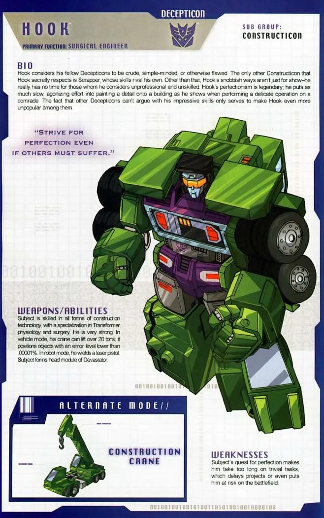 吊钩以优秀珠宝匠人般的细心和精确,以及令所有变形金刚望尘莫及的技巧履行他的工作。不论是重新接通一支受损的微芯片,还是把一架两吨重的大梁安装入位,事无大小,完美是他的终极目标。或许因为他是一个完美主义者,所以他对他的挖地虎同伴抱持一种恃才傲物、高高在上的态度,因为他觉得那些人一个个地既粗鲁又愚蠢。尽管吊钩没可能获得什么“人见人爱大奖赛”,但是这抹杀不了他的高超技能以及他在霸天虎邪恶计划中扮演的重要角色。