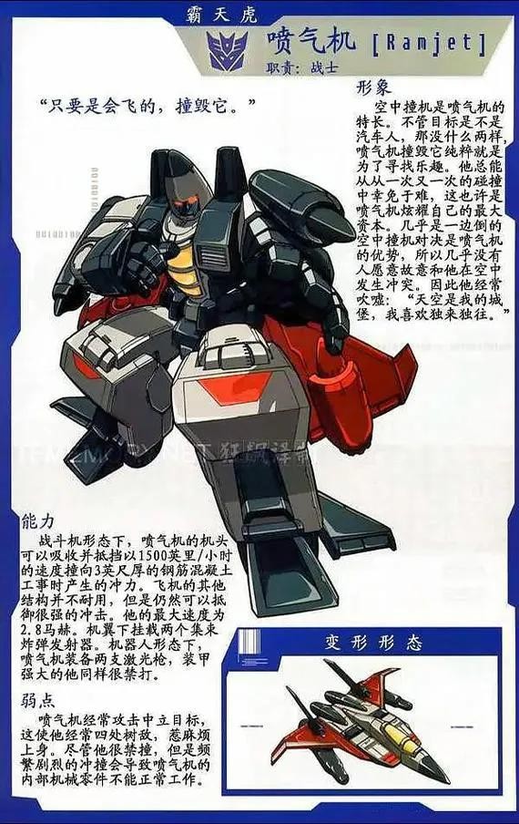 霸天虎成员,拥有惊人的耐力和抗击打能力,可变形为喷气式战斗机,格言是“把会飞的统统撞下去”。