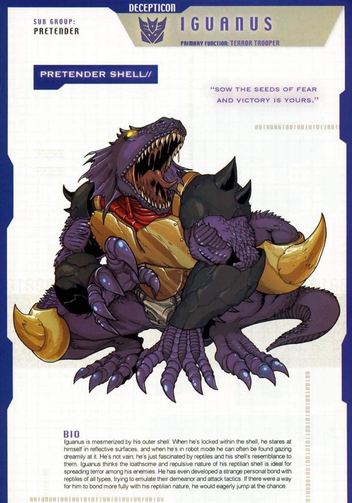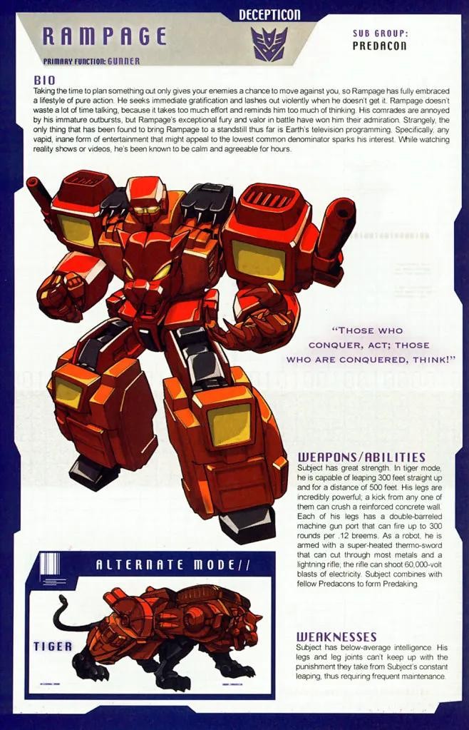无赖兽,霸天虎龙头部队成员。其需要四处走动,搜寻潜在威胁,趁其尚未危及基地之时将其消灭。仅仅守卫基地对无赖兽来说还远远不够。他总是在寻找差错,一旦发现有状况就欣喜若狂。破坏带给无赖兽绝无仅有的兴奋感,他也乐于证明自己的所作所为是正确的。