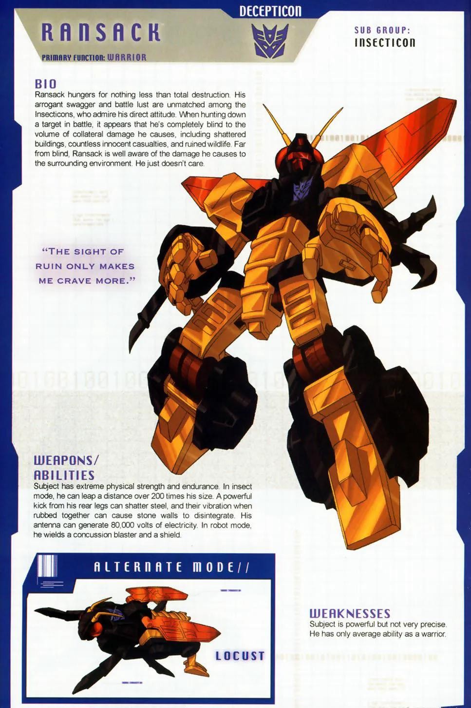 别看洗劫结构并不壮实,但他却是机器昆虫中最好战的一个。为了猎杀一个敌人,他可以踏平一座城,根本不去在意无辜者的伤亡。洗劫语气强硬,从不废话,出手毫不犹豫。在昆虫形态下,他可以跳跃2.4KM远,后腿一击可以踢碎30CM厚的钢板,触角可以发射8万伏的电流。