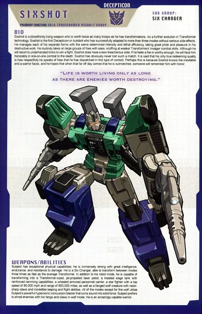 无懈可击的变形金刚战士,具有强大的力量和过人的智慧,他一个人就足以敌得过一队战士。作为变形技术进化典范,通过各种努力,六面兽是第一个成功地变形出三种以上形态的变形金刚,也是变形形态最多的变形金刚。他能够在他变化出的多种形态下,依然保持统一的人格和致命的攻击力。六面兽以此为荣,并倾心于他的一系列破坏性工作。