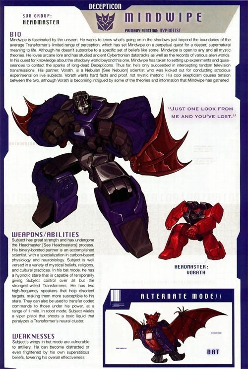 蝙蝠魔,霸天虎头领战士的成员。蝙蝠魔是一个神秘的角色,蝙蝠魔被那些不可见的事物深深吸引着。他宁愿花费大量时间试图与早已死去的霸天虎亡灵的电磁波相感应,而不愿与活着的人交谈。