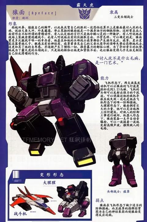 猿面是霸天虎头领战士成员,三变战士,变形模式为巨猿和战斗机。